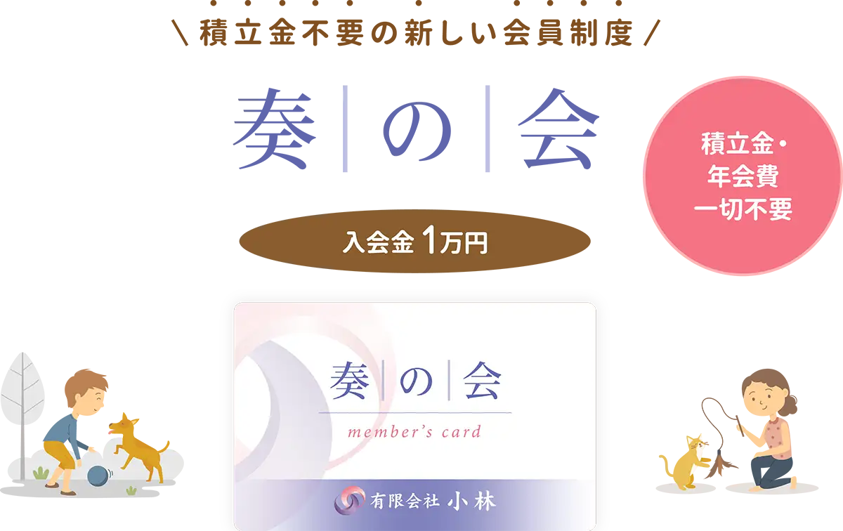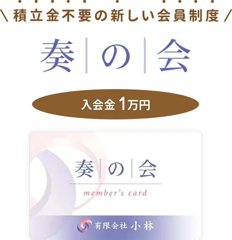 「奏の会」とは、万一に備えてご遺族のご負担を少しでも軽減することを目的として生まれたシステムです。事前に入会しておくことで、葬儀の時に安心のサポートと充実した特典・割引サービスが受けられるお得な会員制度です。